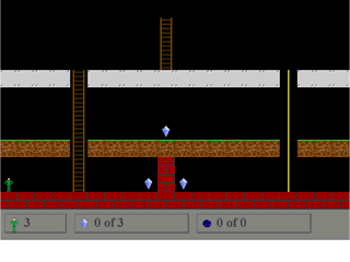 Up to this point, the large majority of the games play area was not utilized. This level clearly solves that problem. As you can clearly see, this level has platforms that are above the ground. You can also see that the different surface types are able to be placed anywhere on the game screen. There are also a rope and a couple of ladders on this level, though one of these ladders seems to be heading nowhere. You will notice that this time there are also three energy crystals on the level. All three of the crystals must be picked up before the exit will be revealed.