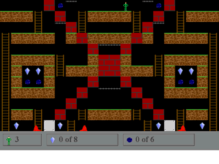 Work your way to the bottom of the screen and retrieve the energy crystal on bottom. You will notice that this double-laddered grass platform is ideal for evading the slime. What you eventually want to do is climb up the long ladder crossing over the box with the energy crystal and holes in it. Drop a hole on the top and fall through the hole before the slime gets close (otherwise you may lose a hole) and drop another hole to get out. Use the grass platform to dodge the slime by waiting for it to get near enough then quickly climbing down the ladder and running to the big ladder. Recover the hole on the box and place it over the other energy crystal and drop down again. Dodge the slime and recover the hole. One more slime dodge and you are able to climb up to the top of the big ladder and cross back into th top portion.