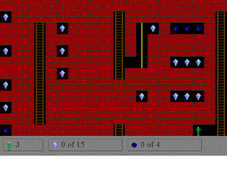 Climb the ladder. Walk through the top row of fake bricks until you come to the ladder. Climb down a notch. Walk left until you pick up an energy crystal. Continue left until you reach the ladder. Climb to the top of the ladder and get the energy crystal to your left. Return to the ladder. Climb down a couple of notches and drop a hole to your left. Get the energy crystal and then retrieve the hole Drop down three notches (this includes the notch you climbed up to retrieve the hole) and drop a hole to the left Get the energy crystal and retrieve the hole. The bottom left energy crystal does not have a brick blocking it so you only need to go to the same level as the crystal and walk over to it. Climb down to the bottom of the screen. Work your way to the right side ladder as you did before.