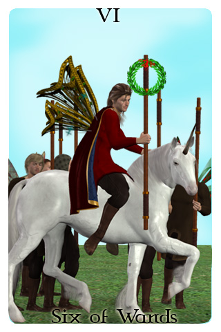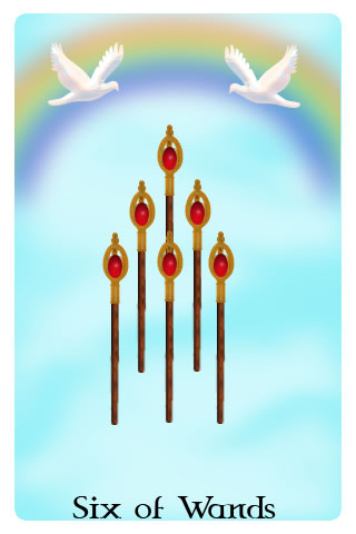 The Six of Wands represents Triumph. This card is all about victory. Taking care of business and looking out after yourself ultimately allows you to reach your goals. The presences of this card often symbolizes that you will be the center of attention so enjoy your time in the spotlight.