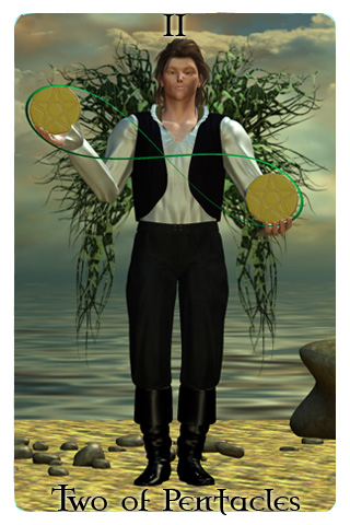 The Two of Pentacles reflects a persons ability to adapt to ever-changing needs. All this juggling may seem overwhelming but remember that there are a lot of people who take up the hobby of juggling to relax. Even though you may have a lot of things to juggle, the fundamental thing is to make sure that you are enjoying yourself while you do it.