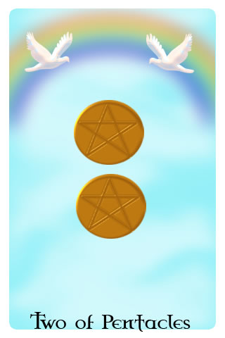 The Two of Pentacles is about juggling your needs. While you may have to deal with several problems at the same time, you have enough confidence in your abilities to succeed. Sometimes it may seem as if there are just too many different things to juggle, but you have to find a way to balance different and possibly conflicting needs.