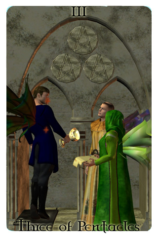 The Three of Pentacles represents the craftsman. It focuses on professional growth. While demonstrating your abilities is important, be careful not to become overly obsessed with the minor details of your work. If you do not have all the skills necessary to succeed then it is important that you begin to acquire the necessary skills.