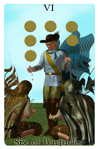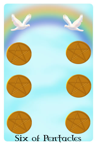 The Six of Pentacles represents charity. This is usually a good sign as in order to be giving to charity you usually have to have an abundance of wealth which likely indicates prosperity. Not all support of charity is financial, however. Any support of a good cause can be considered charity. This card is usually interpreted as supporting people in need.
