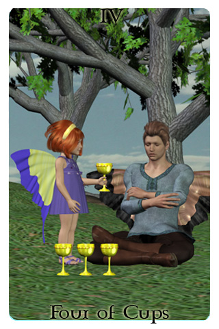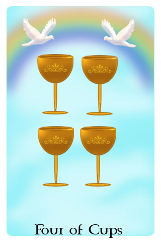 The Four of Cups represents apathy. It is about being so withdrawn, possibly as a result of prior loss, that you don't see what is right under your nose. This apathy could be a result of taking things too personally. Sometimes bad things happen to good people. Also remember that when someone says that it is just business, it probably is because business is far too often about the bottom line not what is right or wrong.