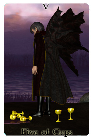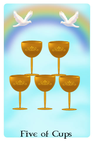 The Five of Cups represents loss. This card reflects the grief that you may feel over something being taken away from you. While the disappointment and loss may seem overwhelming, it is important to accept things the way they are if you want to be able to move into the future. The future lies ahead of you and can be whatever you make it but in order to make something of the future you need to stop looking at the lost opportunities of the past. The past is gone unless you have a time machine (in which case we at Blazing Games would appreciate you sending us an e-mail with next week's winning lottery numbers for the Canadian Lotto 6/49 or Lotto Max lotteries).
