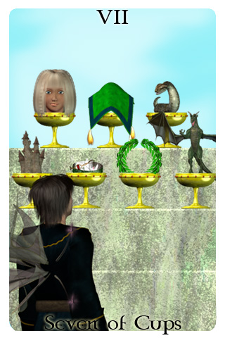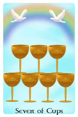 The Seven of Cups is about wishful thinking. This card is all about indulging in too many excesses in life. This card is most applicable to people who are living for today without any concern for tomorrow. While self-indulgence is certainly not a bad thing, doing so when you can't truly afford to do so is the path to trouble. Expecting things to only get better and not putting away a nest-egg in case things go the other way is the main warning of this card.