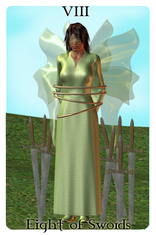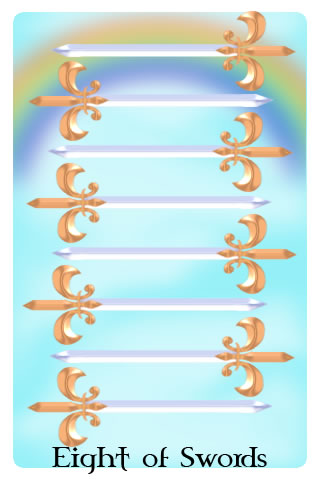 The Eight of Swords represents vulnerability. This is a time when your situation is currently getting the best of you. You are feeling all tied up and are unable to see your choices. The keywords here are 'feeling tied up.' You are not without the resources necessary to get out of your present situation, you just need to find focus and clarity.